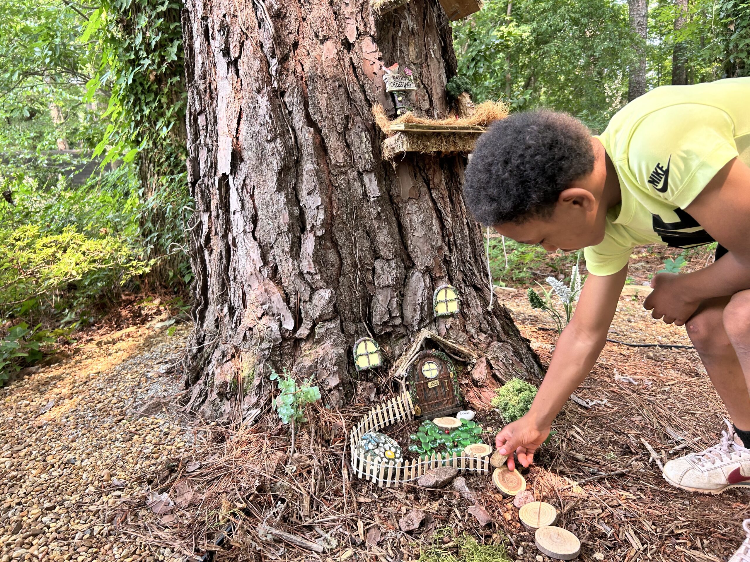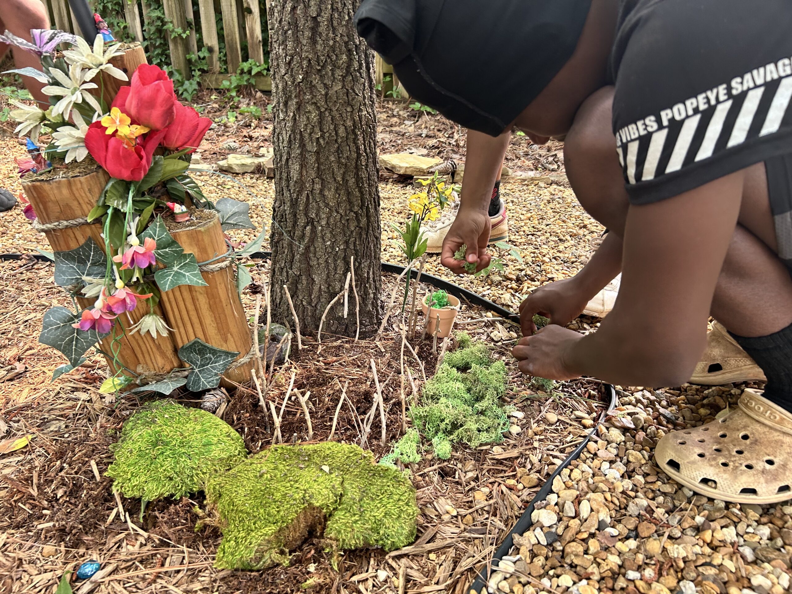 This summer we also asked our students to give back to the community in unique and fun ways. One fun project we did this month was helping build a fairy garden for one of our elderly partners in the community. She has always loved having fairy gardens at her home but is unable to continue building them herself.  A group of our students spent an entire day helping her repair and build these whimsical gardens and they had a blast giving back while enjoying time outside and being creative.